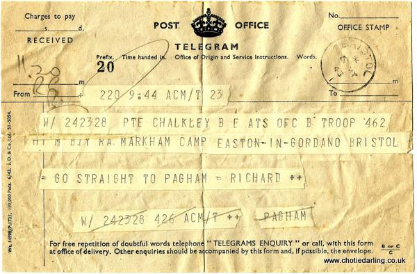 I was very disappointed with your inability to make Pagham, but realise what the hell of a journey Bristol is. But why didn’t you send a wire or something? Then I could have come down. Brinner and Diller were home as you probably know. We could have got really stewed – actually we did, but that’s another story. However, we must try again soon. I shall be able to get a week-end here and there, though I expect to be up to my eyes in work. I’ve been very lucky here in getting a room with Chunky* and Brian (my mates …. ) and an excellent servant who knows all the tricks of the trade – and then some.