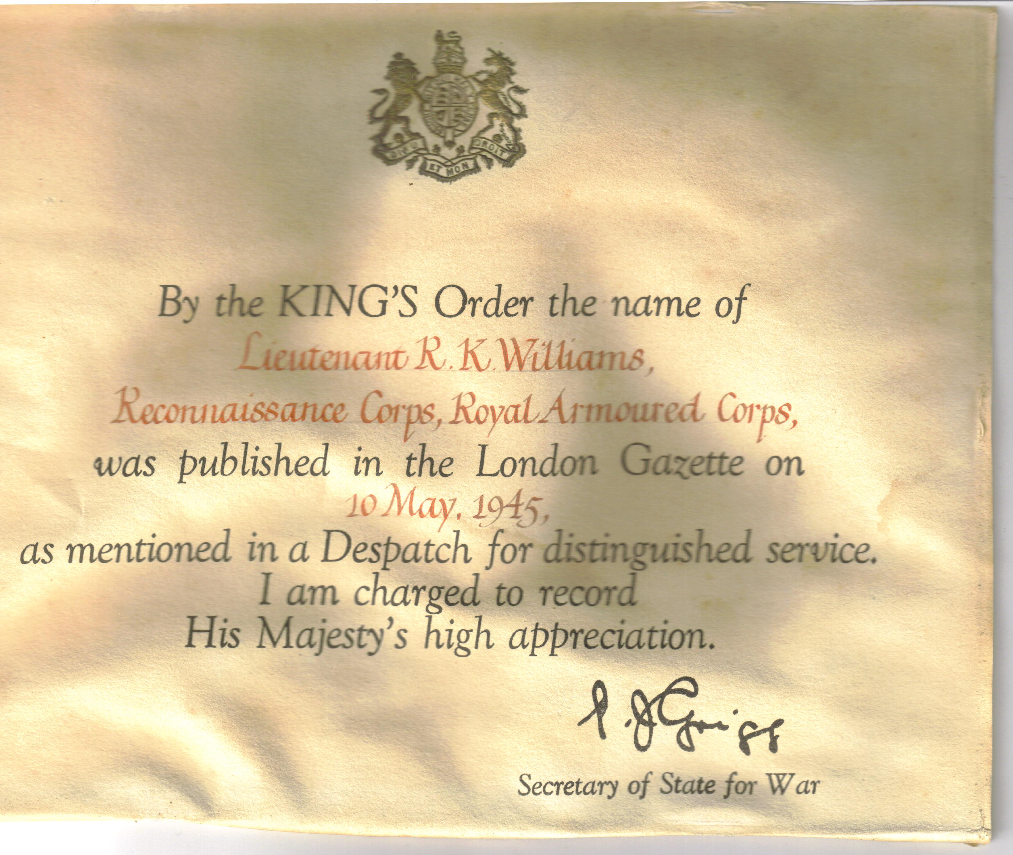 We would miss Mr Williams. He had been with us from Normandy June ’44 to March ’45. From a trooper’s point of view this Officer had looked after his eleven men and never asked us to do or risk anything that he couldn’t do himself. We liked Mr Williams and we were going to miss his coolness. He thought his troop were a good team too…