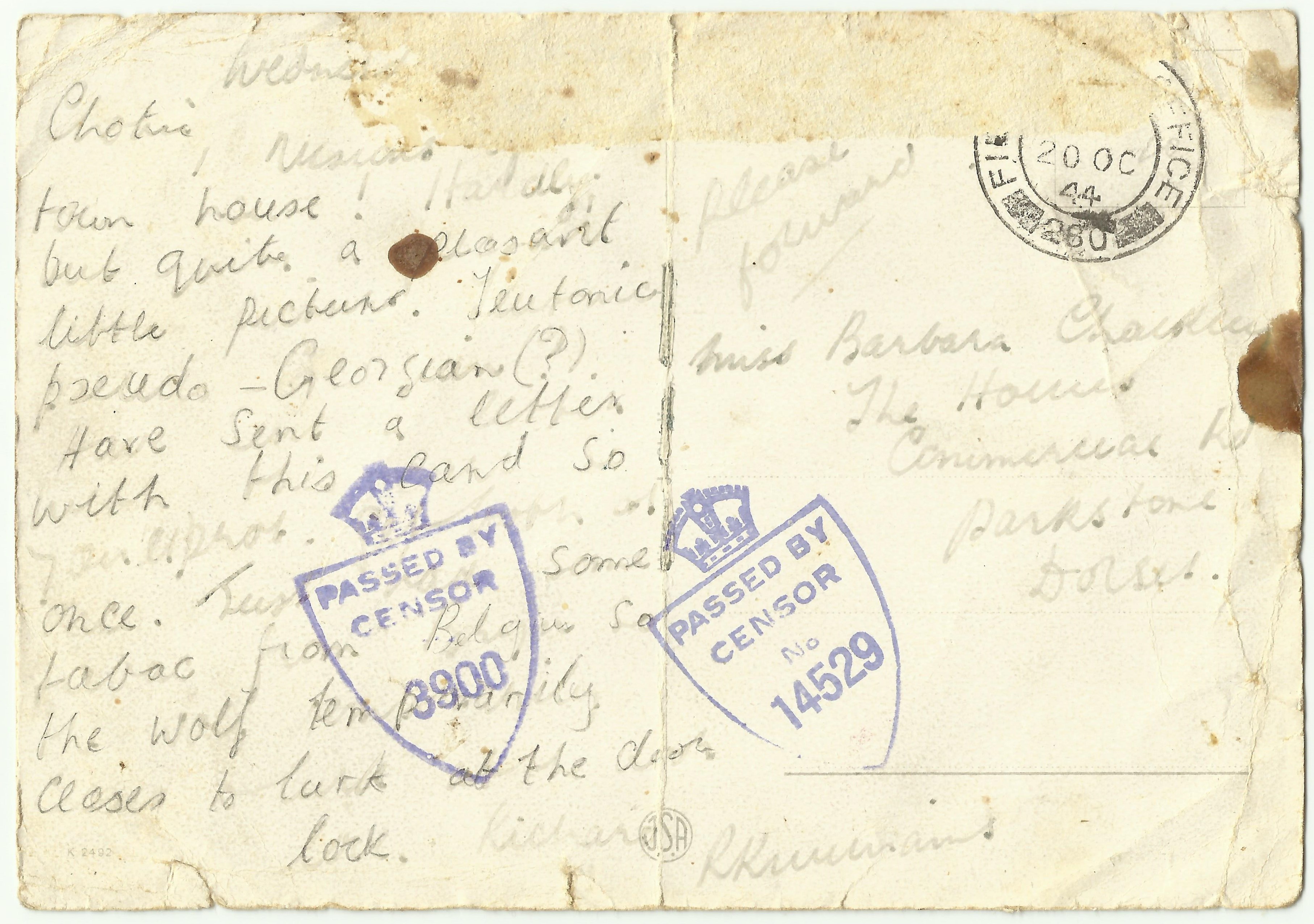 Chotie wrote to him from her home in Parkstone where she was enjoying being 'Absent without leave' with her best friend, Mary Dakin. She wrote again later, after a miserable time at the dentist, having broken a tooth on her mother’s home-made toffee. She was meant to return to her unit now after 14 days leave.
