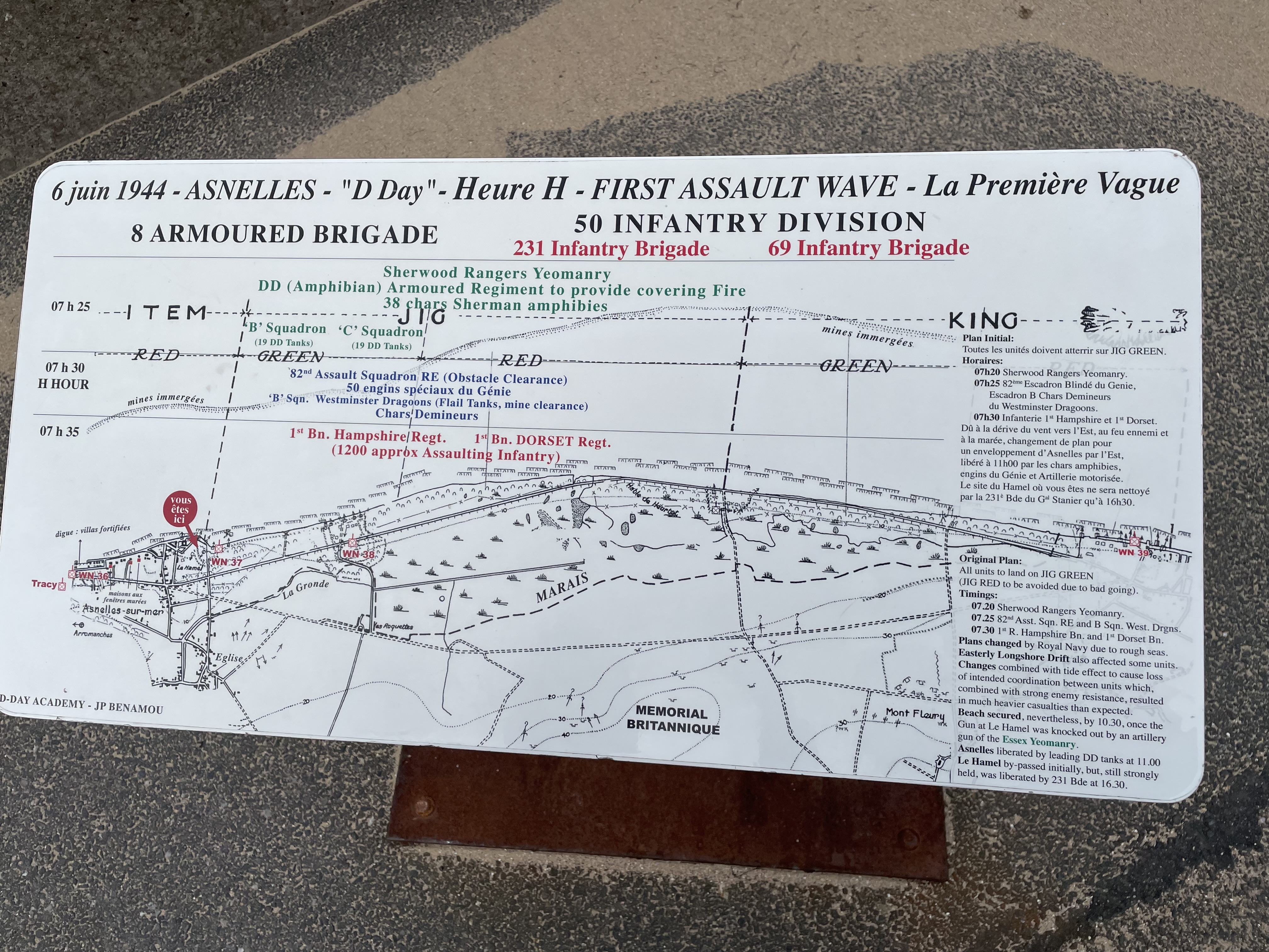 East of these cliffs there is the lower lying land of Gold Beach's 'Item', 'Jig' and 'King' sections. Here at Le Hamel, by Asnelles, you can still find the remains of a German gun emplacement with a sign explaining the role of the 50th (Northumbrian) Infantry Division in the assault.